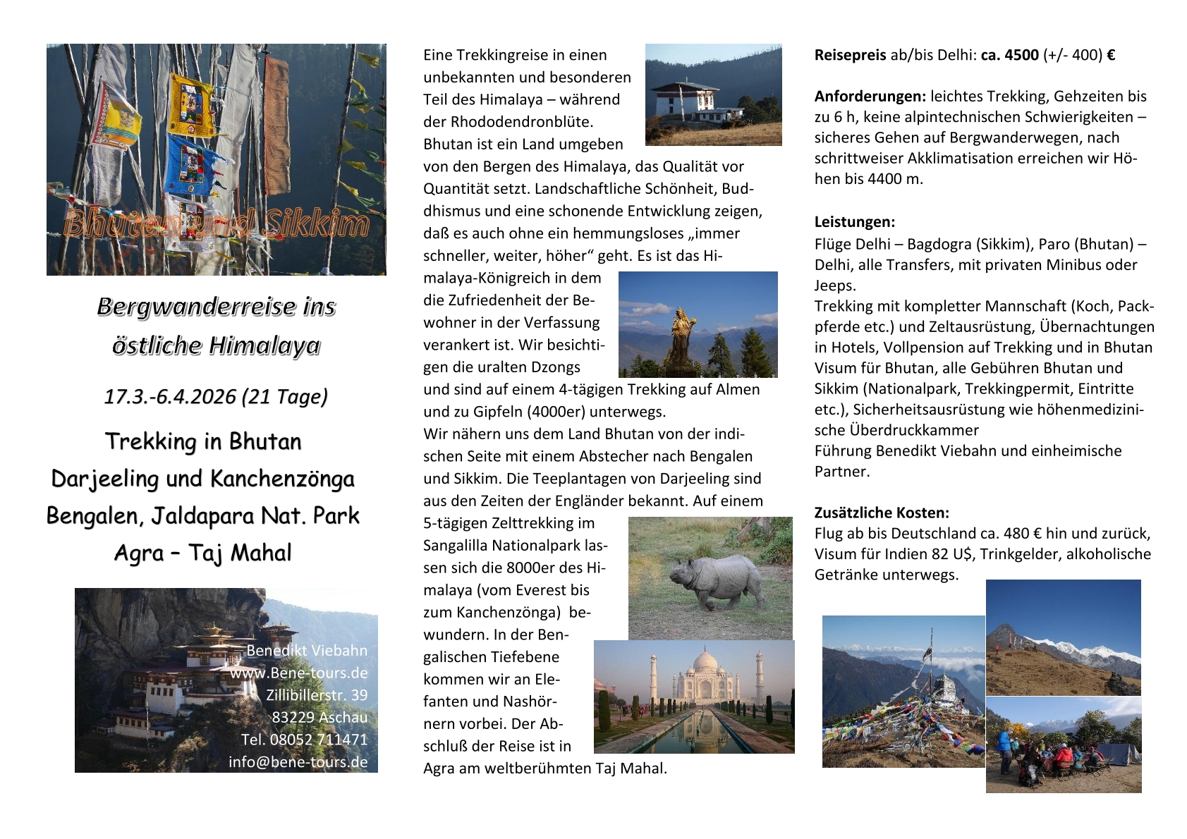 Dies ist eine Wanderreise mit vielen Höhepunkten. In Sikkim und Darjeeling lernen wir einen unbekannten Teil Indiens kennen (und akklimatisieren uns). Einreise auf dem Landweg nach Bhutan durch Bengalen. Komforttrekking im Land des Glücks (Bhutan) mit den highlights buddhistischen Lebens. DFlug dem Himalaya entlang zurück nach Delhi und Besuch des Taj Mahal.